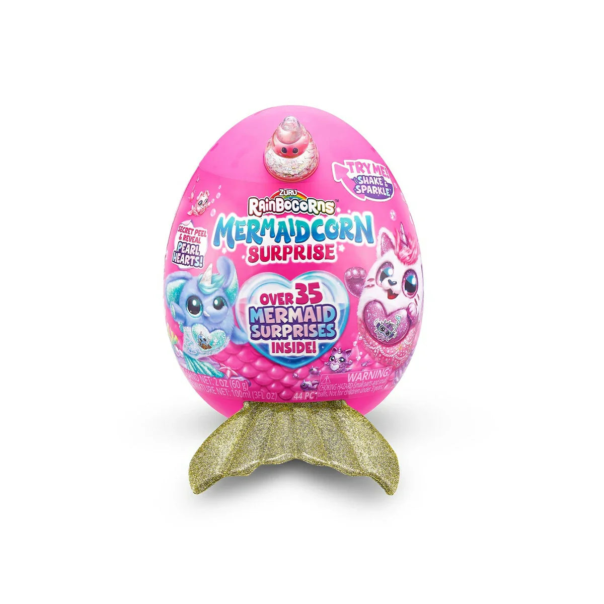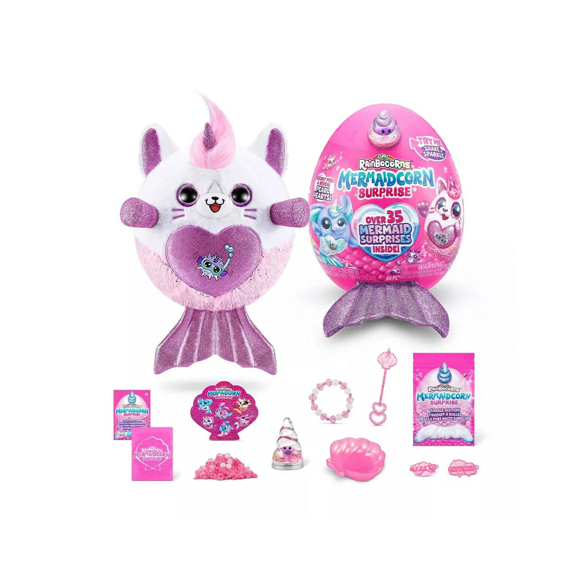 These Mermaidcorns are ready to make a splash in Rainboville! Hatch open your egg to unbox your new fin-tastic friend and over 35 surprises! These cuddly plush come with a shiny mermaid tail and a boo-boocorn hidden inside a their water globe horn! There are 6 Mermaidcorns to collect, each one with a peel and reveal heart to tell you what your Mermaidcorn loves! Explore Mermaid Cove and find your new cuddly bestie!