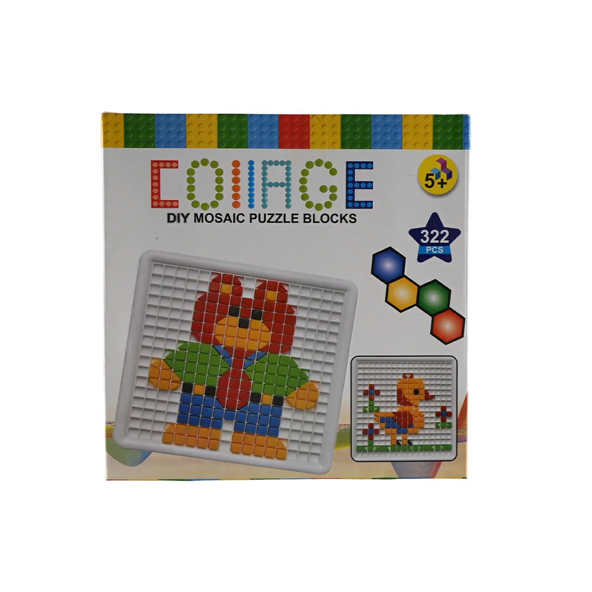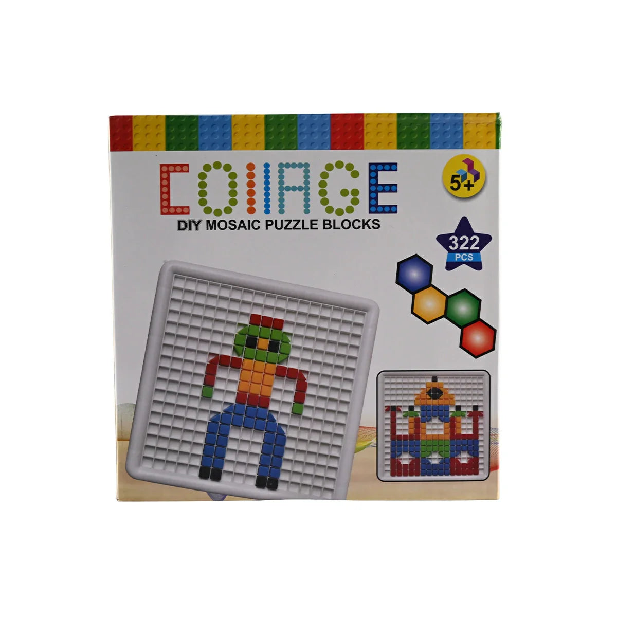 The "Coinage DIY Mosaic Puzzle Blocks" is an extensive 322-piece creative set designed for children aged 5 and up, encouraging artistic expression and fine motor skills. This set includes a pegboard and numerous small, colorful hexagonal and square-shaped blocks that fit together to create intricate mosaic designs. The packaging illustrates examples like a bear and a deer in a garden, inspiring children to follow patterns or invent their own. This toy is perfect for developing color recognition, spatial reasoning, creativity, and hand-eye coordination as kids bring their pixelated visions to life.