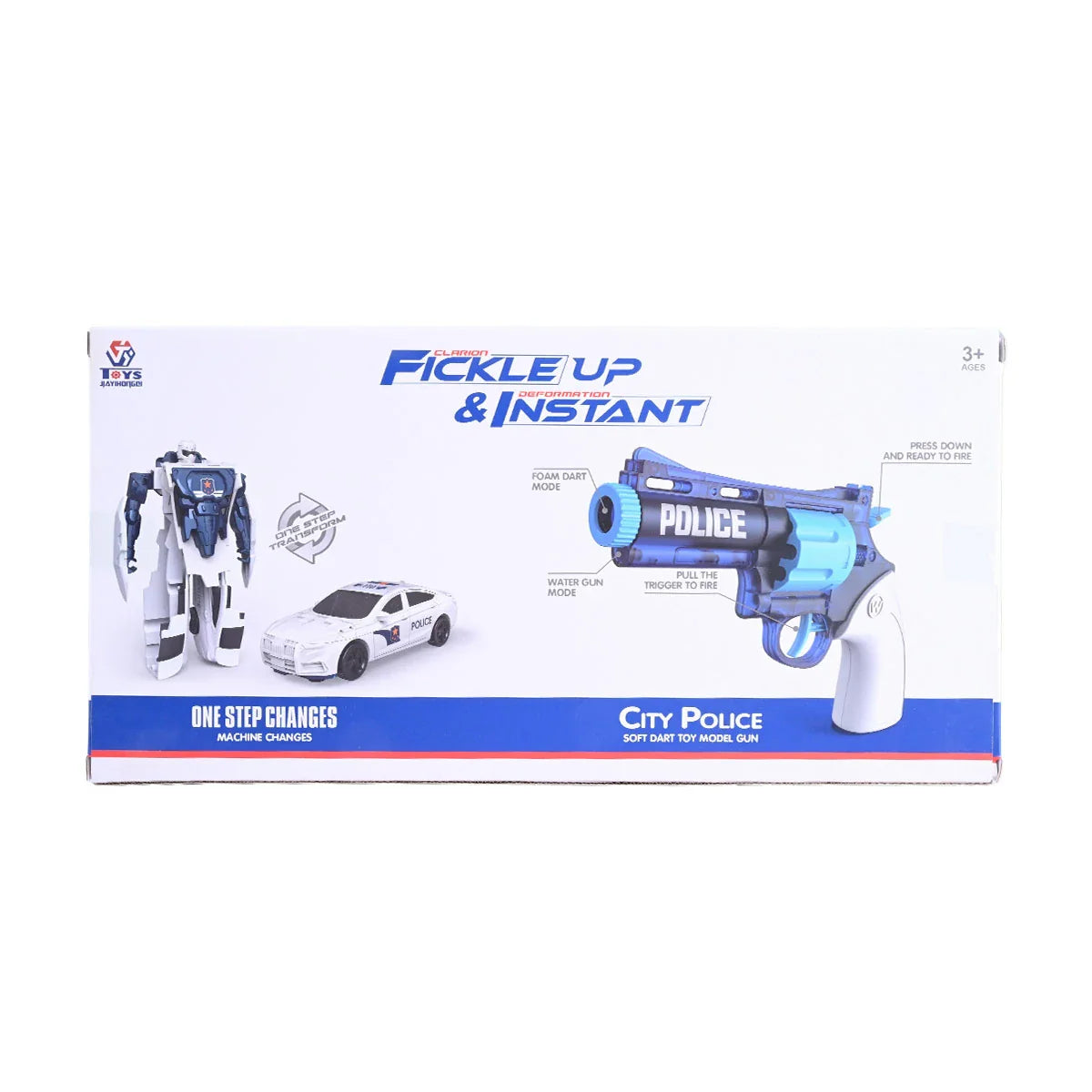 Unleash double the fun with the Fickle Up & Instant City Police 2-in-1 Transforming Robot & Soft Dart Gun Set! This action-packed toy set brings together the excitement of transforming vehicles and the thrill of a soft dart blaster.