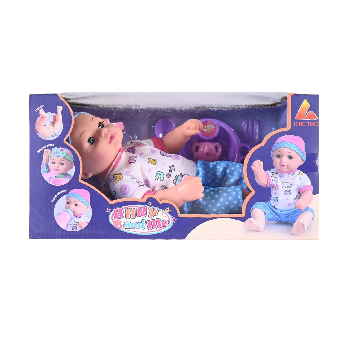 The KING TIME "Baby and Me" baby doll set offers a delightful and interactive nurturing experience for young children. This set features a charming baby doll designed to simulate various infant actions, promoting imaginative play and empathy. The doll can "pee," "suck a pacifier," and "drink water," providing a realistic caregiving scenario. Included accessories like a pacifier, bottle, and other care items enhance the play experience, allowing children to engage in feeding, comforting, and changing routines. This set is perfect for fostering responsibility and creative storytelling in young caregivers.
