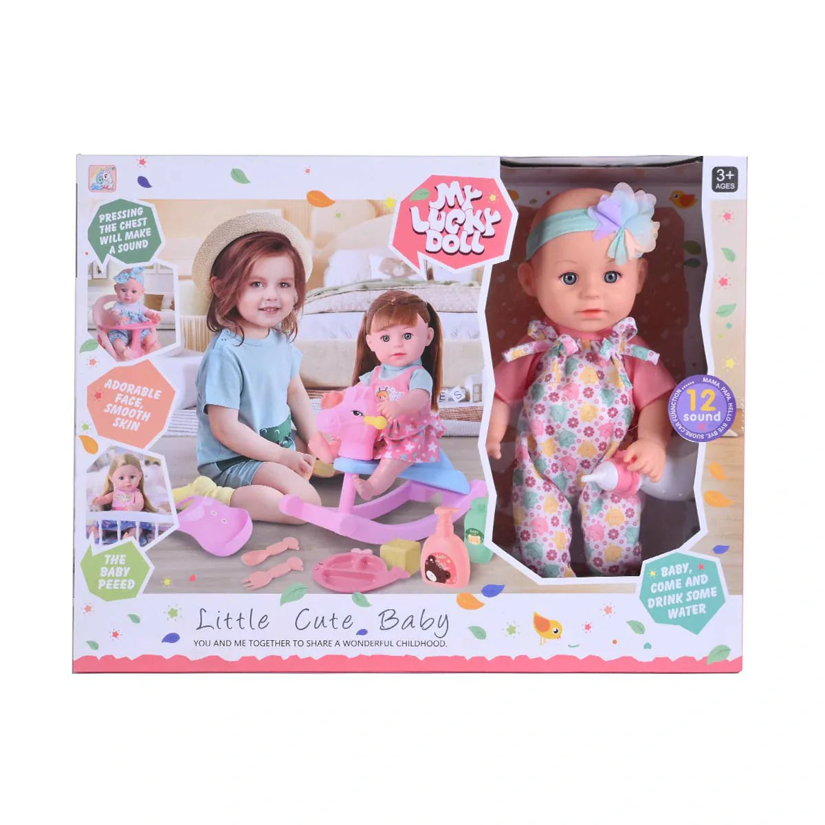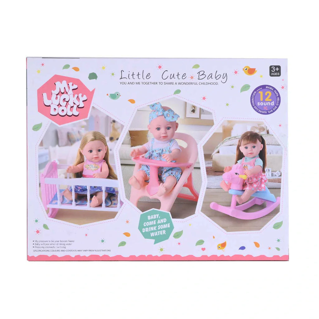 Meet the adorable "My Lucky Doll Little Cute Baby," a charming interactive doll that offers hours of nurturing playtime. This delightful baby doll features a sweet face and comes dressed in a cute outfit. Pressing the doll's chest activates sounds, adding to the realistic play experience. The set also includes various accessories, allowing children to engage in feeding, comforting, and imaginative caregiving scenarios. It's a wonderful toy to encourage empathy and role-playing in children aged 3 and up.